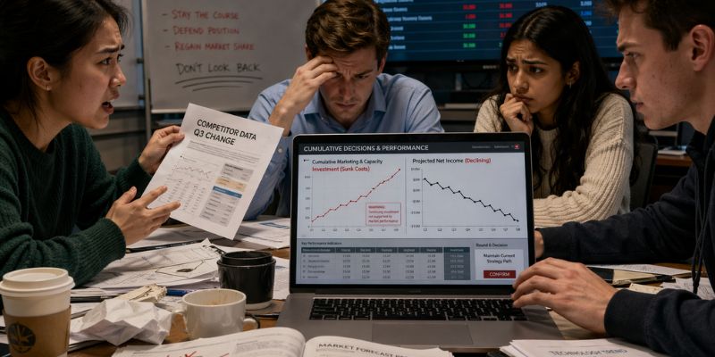 If overconfidence shapes the opening behavior of MBA simulation teams, the sunk cost fallacy tends to define their middle game. The phenomenon is well documented in behavioral economics and appears with striking regularity in educational settings.